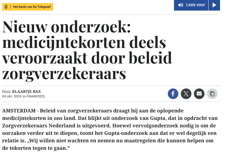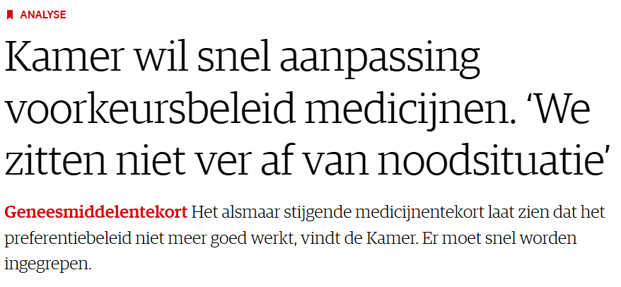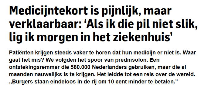 Reden voor de tekorten in Nederland is dat zorgverzekeraars te weinig inkopen bij de geneesmiddelenfabrikanten. Als er geen geneesmiddelen voorradig zijn, hoeven de zorgverzekeraars ook niets te vergoeden. Of de zorgverzekeraars dwingen geneesmiddelenfabrikanten tot zulke lage prijzen dat Nederland niet meer rendabel is. Dan verdwijnen er medicijnen uit ons land. Dankzij de Europese Patiënten Richtlijn van de Europese Commissie mogen Nederlandse patiënten met een geldig recept van de huisarts hun medicijnen bestellen bij een online-