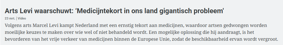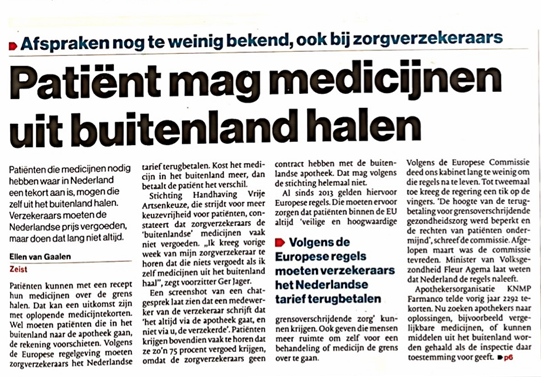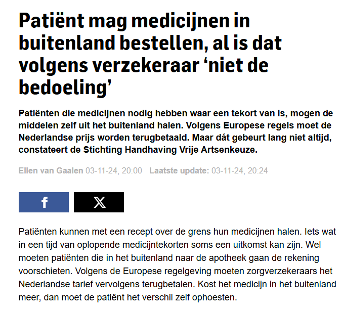 Uiteindelijk heeft onze oproep uit 2014 aan de Europese Commissie om deze rechtsongelijkheid te onderzoeken, geleid tot een inbreukprocedure voor Nederland. Een figuurlijke tik op de vingers. In maart 2024 werd de inbreukprocedure stilzwijgend ingetrokken. Onderzoek van de Stichting Handhaving Vrije Artsenkeuze en de Nationale Geneesmiddelen Monitor leidde ertoe dat de Europese Commissie in november 2024 bevestigde dat de Europese Patiënten Richtlijn ook bindend is voor Nederland. Dat deze richtlijn boven de Nederlandse wet staat en zeker boven de beperkende voorwaarden van de zorgverzekeraars. Dat betekent dat u het volste recht heeft om geneesmiddelen in het buitenland te bestellen. Als het gaat om een geneesmiddel dat in Nederland tekort is of niet verkrijgbaar, heeft u recht op 100% vergoeding van de zorgverzekeraar. Want bij een tekort voldoet de zorgverzekeraar niet aan zijn wettelijke zorgplicht en heeft u als patient volgende Nederlandse Zorgautoriteit recht op 100% vergoeding inclusief bijkomende kosten zoals bezorging. Voor uitgebreide informatie en alle relevante documenten verwijzen wij u graag naar de website over de Europese Patiënten richtlijn: Home - CBHC Nationaal Contactpunt